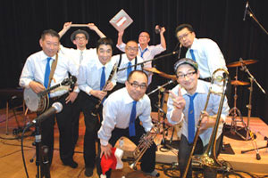 にゅうおいらんず の噺家メンバー 左から 三遊亭右紋 バンジョー 桂伸乃介 ピアノ 助っ人出演のプロドラマー 非力 三遊亭円雀 クラリネット 三遊亭小遊三 トランペット 落語芸術協会事務局員 ベン片岡 ベース 三遊亭昇太 トロンボーン 07年